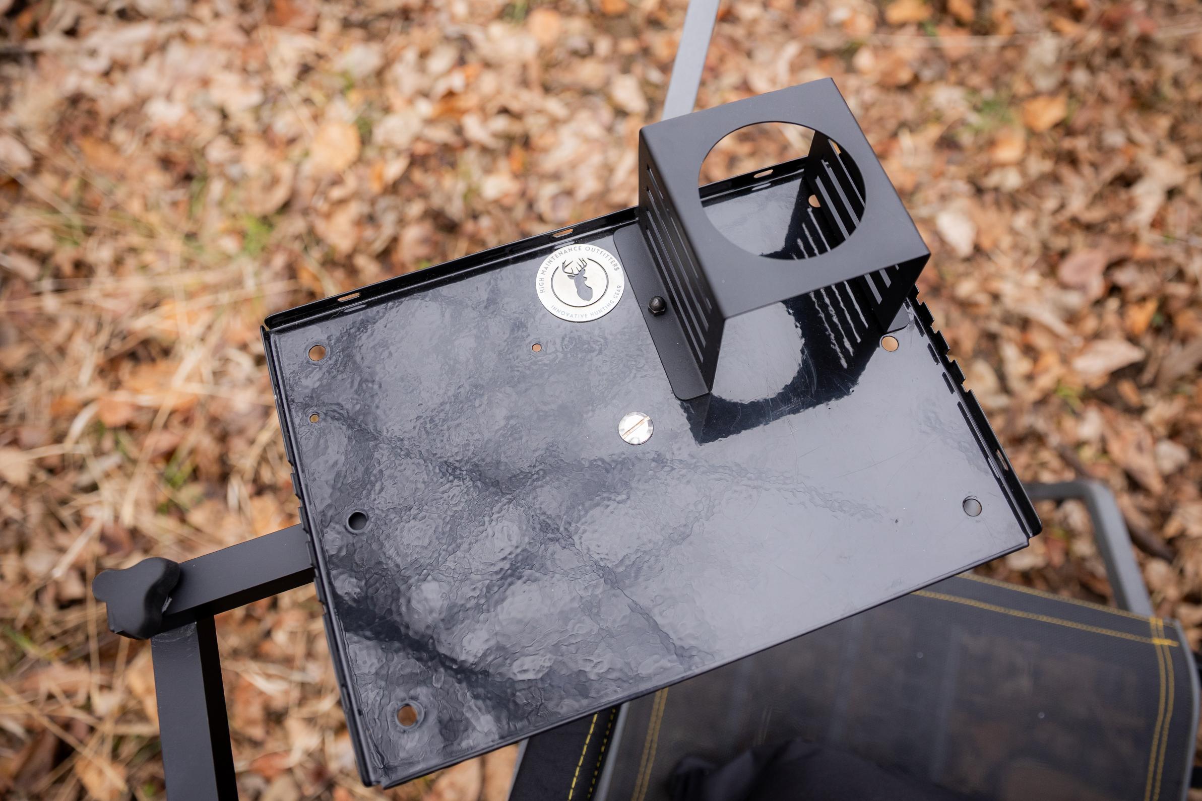 Table/Surface: The table itself is a rectangular surface (tray) with specialized powder coating to minimize noise, which could impact or ruin the hunt. It has a slightly recessed platform with raised edges to secure items. This provides a level surface for placing gear such as rangefinders, binoculars, game calls, snacks, drinks, ammo, or a phone. The tray is 14 x 10 inches.