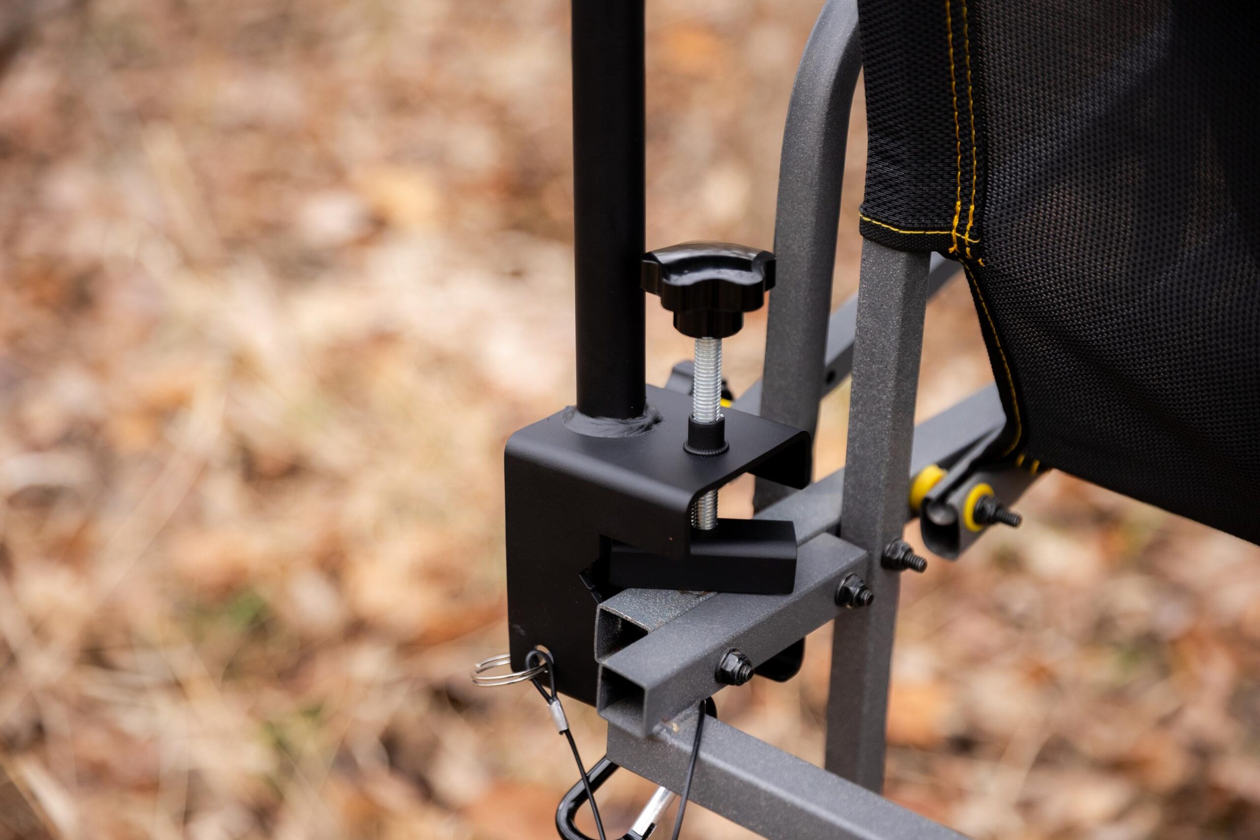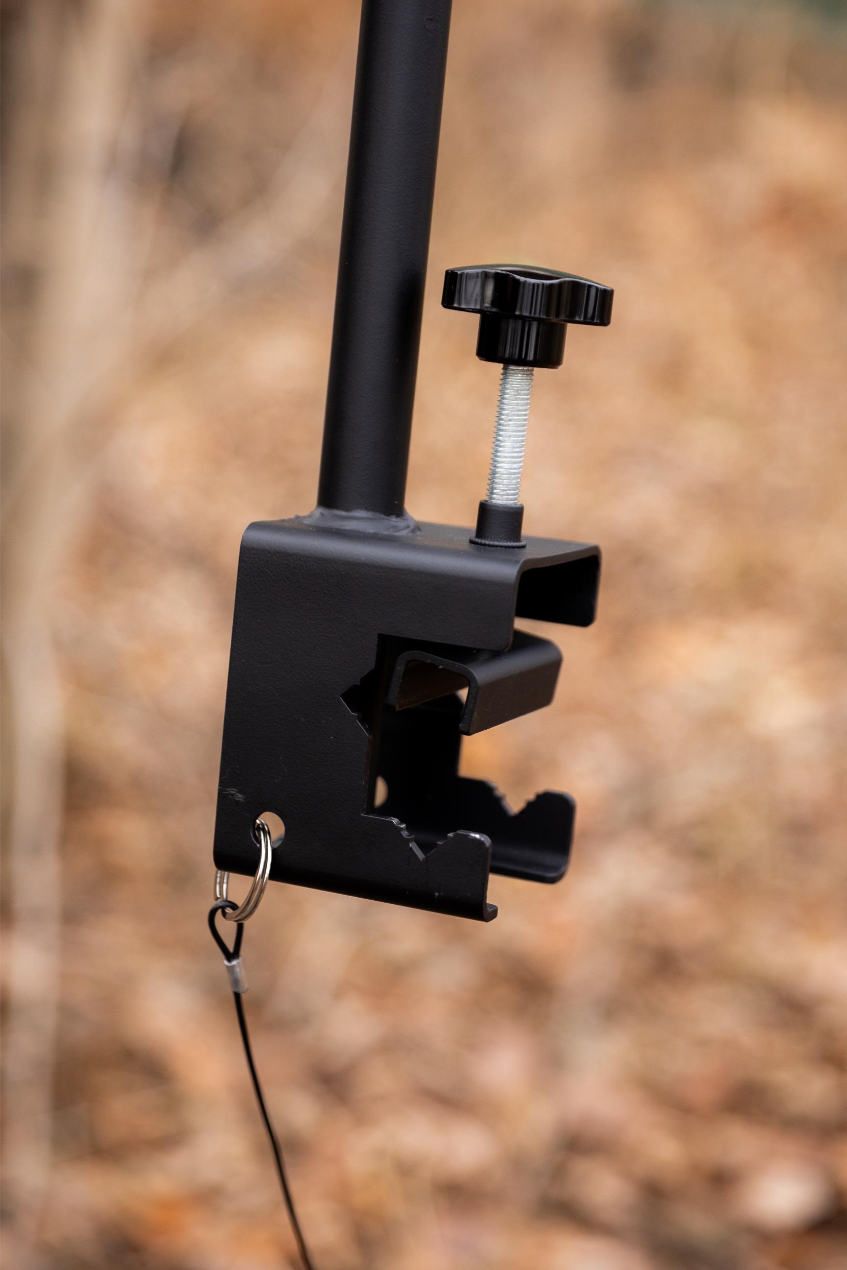 Vertical Mounting System: The key innovative aspect is its mounting system, which allows for quick, secure clamping to the tree stand’s frame without any modifications. The innovative design of the clamp allows it to attach to oval or square tubing. The clamp has two different feet (2.5 inches long and a round) that will come with it.