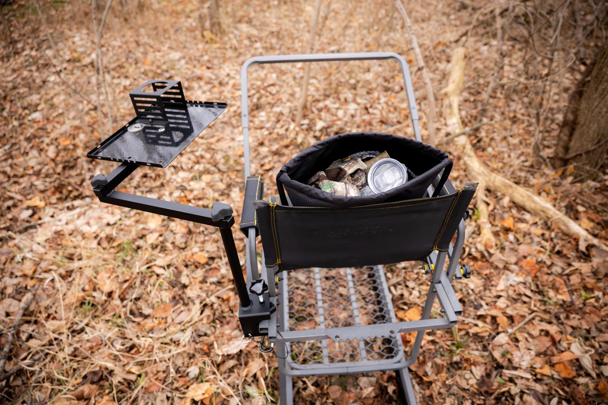 Horizontal Arms: An L-shaped connecting horizontal metal bar rotates 180 degrees in each direction and attaches to the tray. This allows the hunter to move closer or farther away, depending on immediate needs (active shooting vs. sitting/waiting).